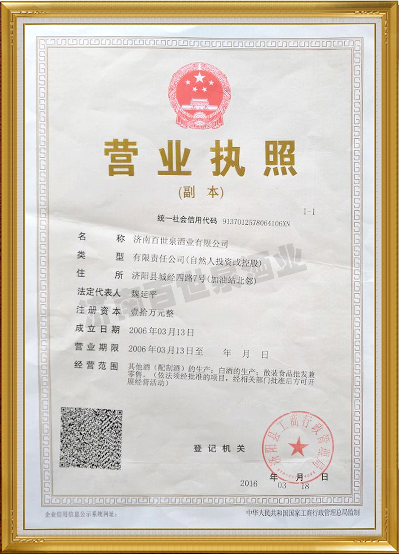 濟南百世泉酒業(yè)有限公司座落于具有食品工業(yè)城之稱的泉城濟南--濟陽。自縣酒廠破產(chǎn)后公司董事長魏延平重組縣酒廠骨干人員創(chuàng)建本公司,解決了部分失業(yè)人員再就業(yè)問題。自2006年創(chuàng)建以來,以“百世泉酒坊”品牌為核心,由之前的散裝酒批發(fā)發(fā)展成為現(xiàn)在的集散裝酒、瓶裝酒研發(fā)、生產(chǎn)、銷售、服務(wù)于一體的國內(nèi)白酒生產(chǎn)基地。